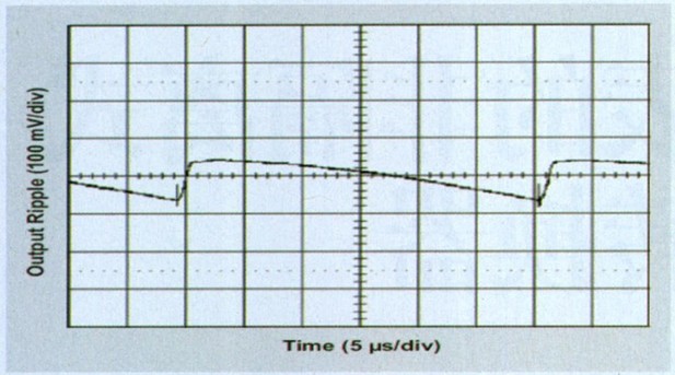 相對較高的K值最小化了電感值,並且經證明是可以接受的,因為這種特殊應用的穩態輸出紋波要求小於0.02 × VOUT,即高負載時的100mVPP。磁滯後,TPS6420x控製器一般在輸出電壓有一些紋波時工作效果最佳,建議使用至少 50mΩ ESR的輸出電容可產生ΔVPP(ESR) = ΔIL × RESR的紋波電壓,其一般遠超出電壓紋波的電容分量。圖2顯示了該應用測得紋波。