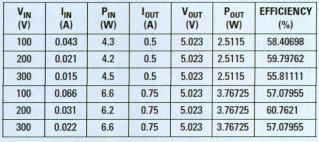 電容C4值設定大於Q4的柵極電容,但其必須足夠小,以便在更短控製器最小導通與斷開時間期間能夠得到再充電。圖3顯示了300V和500mA負載輸入電壓下,一個開關周期的柵極和漏極導通/斷開時間。表1顯示了測得的轉換效率。