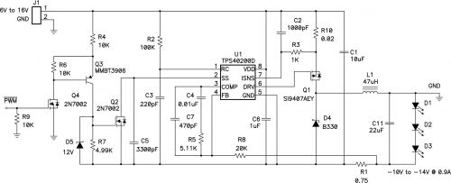 圖 1 顯示在恒定電流配置中驅動 3 個 LED 的de反fan相xiang升sheng降jiang壓ya電dian路lu示shi意yi圖tu。該gai電dian路lu擁yong有you諸zhu多duo優you點dian。首shou先xian,它ta使shi用yong了le標biao準zhun降jiang壓ya控kong製zhi器qi,不bu但dan能neng將jiang成cheng本ben降jiang到dao最zui低di,並bing有you助zhu於yu所suo有you係xi統tong級ji的de再zai利li用yong。如ru果guo需xu要yao,設she計ji人ren員yuan也ye可ke以yi輕qing鬆song改gai造zao該gai電dian路lu以yi利li用yong整zheng合he型xing FET jiangyakongzhiqihuotongbujiangyatuopulaitishengxiaolv。zhezhongtuopushiyongdegonglvjiyuanjianshumuyujianyijiangyazhuanhuanqixiangtong,yincikejiangqiehuanwenyaqideyuanjianshujiangzhizuidi,tongshidadaoxiangduiyuqitatuopudezuidizongtichengben。youyu LED 本身的輸出為光線,就係統級而言 LED 因受到負電壓而產生偏壓並不會造成影響,跟正電壓的情況不同,也因此使其成為一種值得考慮的電路設計。