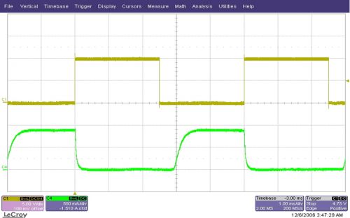 透過軟啟動電容器 C5 的短路快速地開/關轉換器,是調節 LED 亮度一種簡單的方法。圖 2 顯示了 PWM 輸入訊號和實際的 LED 電流。這種 PWM 亮度調節方法較為有效,因為轉換器關閉並且在 SS 接(jie)腳(jiao)短(duan)路(lu)時(shi)僅(jin)消(xiao)耗(hao)極(ji)少(shao)的(de)功(gong)率(lv)。但(dan)是(shi)這(zhe)種(zhong)方(fang)法(fa)也(ye)相(xiang)對(dui)較(jiao)慢(man),因(yin)為(wei)轉(zhuan)換(huan)器(qi)每(mei)次(ci)開(kai)啟(qi)時(shi)都(dou)必(bi)須(xu)以(yi)一(yi)種(zhong)可(ke)控(kong)製(zhi)方(fang)式(shi)逐(zhu)漸(jian)升(sheng)高(gao)輸(shu)出(chu)電(dian)流(liu),進(jin)而(er)在(zai)輸(shu)出(chu)電(dian)流(liu)上(shang)升(sheng)以(yi)前(qian)產(chan)生(sheng)一(yi)個(ge)非(fei)線(xian)性(xing)、有限的停滯時間 (dead-time)。同時,這也將開啟時間的最小負載周期降低至 10%-20%。在一些不要求高速和 100% PWM 調節的 LED 應用中,這種方法或許就已足夠。