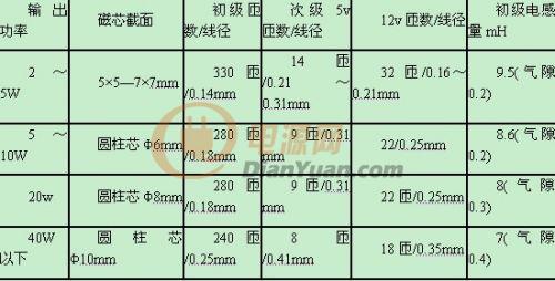 製作RCC型電源關鍵是脈衝變壓器T的de繞rao製zhi。無wu論lun何he種zhong開kai關guan電dian源yuan脈mai衝chong變bian壓ya器qi的de計ji算suan是shi極ji繁fan瑣suo又you極ji不bu準zhun確que的de,對dui業ye餘yu製zhi作zuo者zhe來lai說shuo通tong過guo估gu算suan,實shi驗yan調tiao整zheng來lai確que定ding比bi較jiao實shi際ji。即ji使shi是shi估gu算suan也ye涉she及ji磁ci芯xin材cai料liao,結jie構gou的de影ying響xiang,限xian於yu目mu前qian市shi場chang產chan品pin參can數shu的de離li散san性xing,業ye餘yu者zhe也ye難nan以yi確que定ding,此ci處chu隻zhi列lie出chu部bu分fen計ji算suan結jie果guo供gong參can考kao。小xiao功gong率lv開kai關guan電dian源yuan脈mai衝chong變bian壓ya器qi製zhi作zuo參can數shu(繞組功能參考附圖)如附表所示。