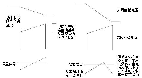 為了從功率可變的電源(即太陽能電池板)析取出最大的功率,太陽能控製器必須采用MPPT。MPPT必須首先找到最大功率點並及時調整環境條件,以保持控製器接近最大功率點。動態MPPT用在係統發生改變的情況下。由於每個開關周期都在發生變化,太陽能電池板汲取的功率也會在每個周期有明顯的改變。動態MPPT利用太陽能電池板的電壓驟降乘以每個開關周期增加的電流,以確定將要產生的誤差信號來調節占空比。動態響應可檢測IV曲線的斜率,從而建立一個功率斜坡,從誤差信號相交點建立一個代表占空比的功率。當斜坡變化斜率從正到負時該周期結束,如圖2所示。
