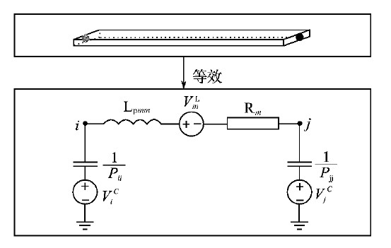 J.Ekman提出了基於寄生參數矩陣的等效電路的建立方法,即把所有互感、互容等效成受控的電壓源,與自感、自容連接(相當於把所有互感、互容對電路的影響等效到受控電壓源上),從而建立等效電路模型。圖4所示為任意兩個節點間的等效電路模型。