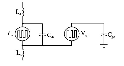 由於需要分別對DM 噪聲和CM 噪聲進行分析,所以對DM 噪聲源和CM 噪聲源也需要分別建模。M.Nave提出使用電流源作為DM 噪聲源,使用電壓源作為CM 噪聲源的方法,就是因為DM 噪聲主要由di/dt引起,而CM 噪聲則主要由dv/dt引起。在此基礎上對CM 噪聲源進行改進,考慮了電壓過衝和下衝,並且在線路阻抗近似平衡的情況下,利用DM 電流源和一個電壓源來表示CM 噪聲源(如圖2所示)。