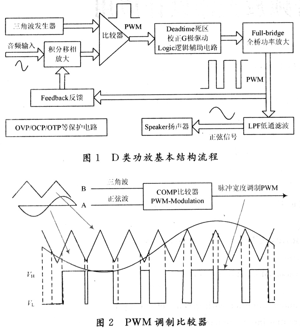 D類放大器由積分移相、PWM調製模塊、G柵級驅動、開關MOSFET電路、Logic輔助、輸出濾波、負反饋、保護電路等部分組成。流程上首先將模擬輸入信號調製成PWM方波信號,經過調製的PWM信號通過驅動電路驅動功率輸出級,然後通過低通濾波濾除高頻載波信號,原始信號被恢複,驅動揚聲器發聲,如圖1所示。