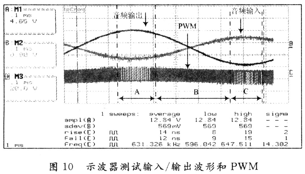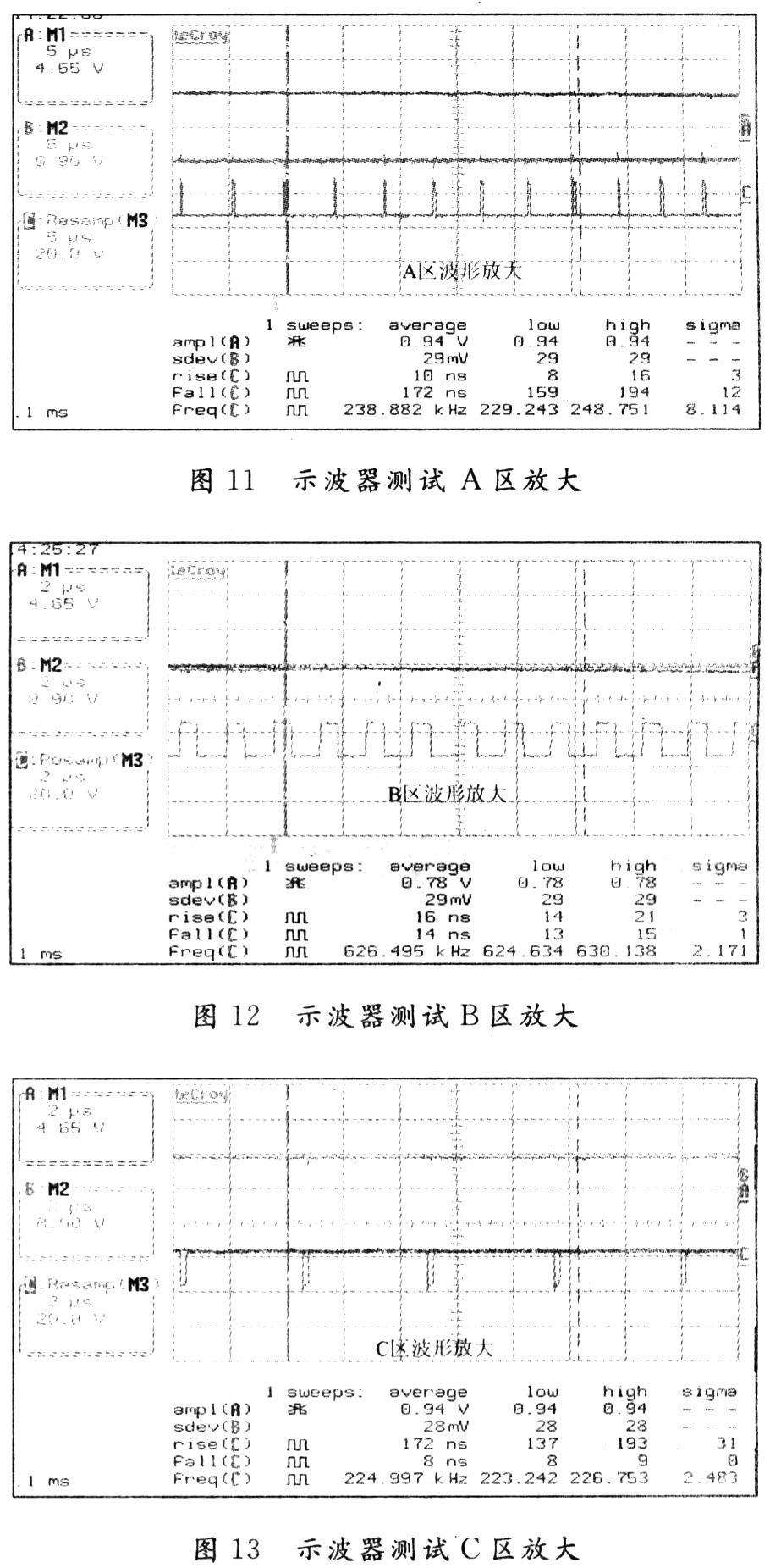 由圖10~圖13可知,輸入波形疊加有高頻雜波。說明前端引入不良幹擾,需進一步分析改進;輸出波形平滑,無交越失真,Deadtime特性較好;輸入/輸出正弦波相位相反,直接由電阻RA128等形成閉環負反饋通路,降低了噪聲幹擾,並進行增益控製。A,B,C區的拓展圖輸出正弦波峰、波穀、S區域處PWM的頻率分別為238.8 kHz,224.9 kHz,626.4 kHz,占空比不同,符合三角波采樣特性。圖中波峰、波穀處PWM脈衝fall下降沿和rise上升沿更為陡峭,相比S形區域,包含大量高頻諧波,易引起EMI輻射,但通過巴特沃思二階濾波器濾波後,輸出正弦波良好,無明顯高頻雜波迭加,EMC測試也無明顯對外輻射頻率,滿足了設計需要。