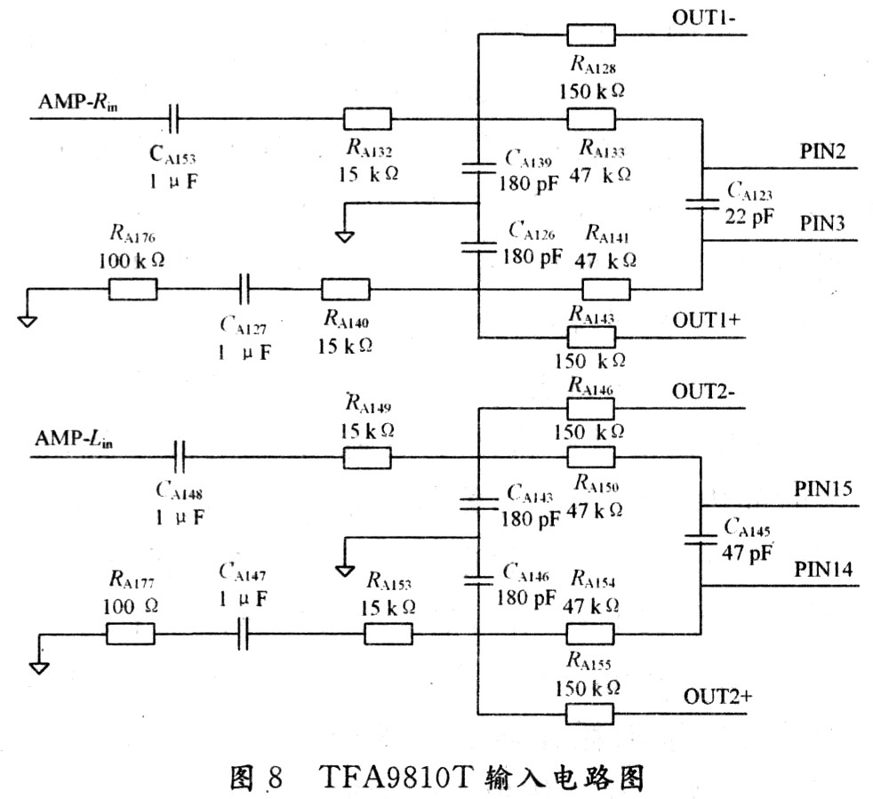 本設計取值1 μF,確定低端頻率為16 Hz,若該頻率定得太高,低端輸入電抗(如在20 Hz)會太大,可能導致輸出端較大噪聲和直流偏移噪聲(plop-noise)。反饋信號與經過緩衝的輸入音頻比較後,通過RA133進入TFA9810T進行PWM調製。為避免圖8中Rin/Lin輸入信號頻率因半導體非線性產生和頻和差頻,導致輸出端出現嘯叫聲,則通過調整電容CA123/CA145,將兩路載波頻率調差50 kHz左右。本設計中將取CA123=22 pF,CA145=47 pF,實現了Rin/Lin載頻相差50 kHz。