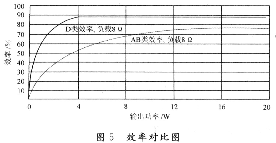 由上述公式得知,D類功放中負載RL,相對其他電阻,比值越大效率越高;MOSFET作為續流開關,所消耗的功率幾乎等於MOSFET導通阻抗上I2RON損耗和靜態電流總和,相比較輸出到負載的功率幾乎可忽略。所以,其效率遠高於線性功放,如圖5所示。非常適應現今綠色節能的要求,適合被平板等數字視聽產品規模使用。