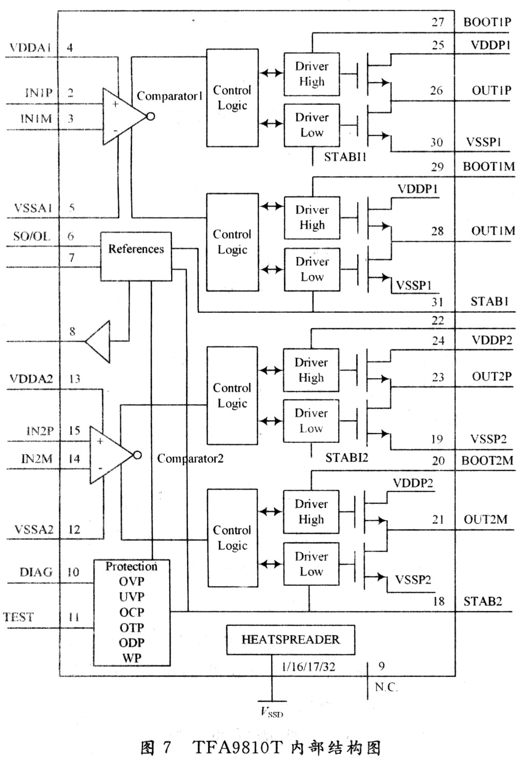 TFA9810T是NXP公司推出的雙通道額定輸出2×12 W的高效Class-D類功放,主要由兩組全橋功率放大器(Full-Bridge)、驅動前端、邏輯控製、OVP/OCP/OTP等保護電路、全差分輸入比較器、供電模塊等構成,如圖7所示。