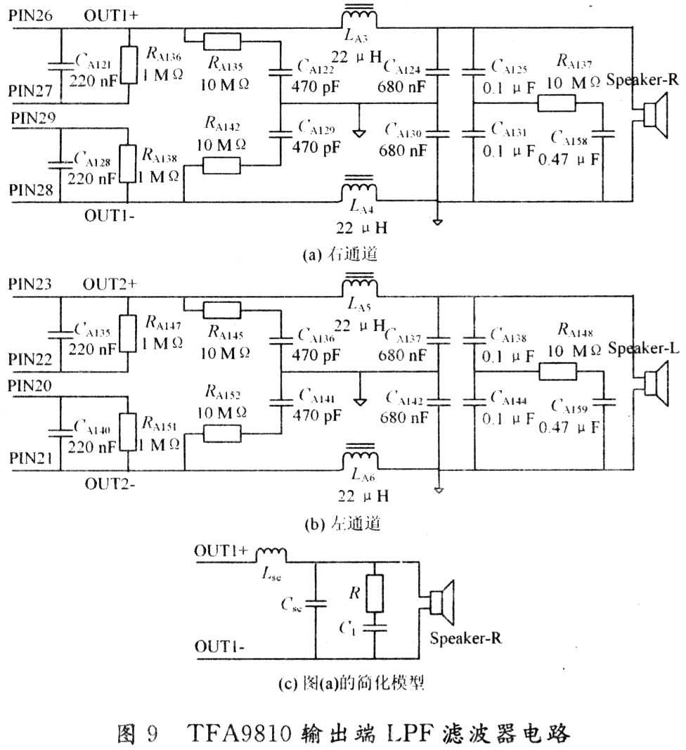 TFA9810T輸出端低通濾波器采用二階巴特沃思濾波器方式,實際的巴特沃思二階濾波器由圖9中RCA類電子元器件CA135/RA145/CA136/LA5/CA137/CA138/RA148/CA159/CA140/CA141/RA152/LA6/CA142/CA144等構成,對PWM方波中15 Hz~20 kHz音頻成分表現為直通效應,對超過音頻範圍的20 kHz以上高頻成分呈現-12 dB/倍頻程滾降率。