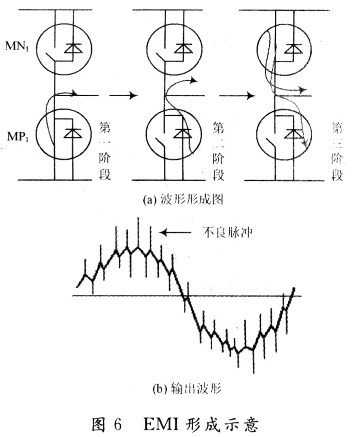 第一階段,MP1-MOSFET導通,有電流流過MOSFET和後級LPF電感;第二階段,全橋進入Dead-time期間,MP1本身關斷,但其體二極管依然導通,保證後級電感繼續續流;第三階段,Deadtime期結束,MN1導通瞬間,若MP1體ti二er極ji管guan存cun儲chu的de剩sheng餘yu電dian荷he尚shang未wei完wan全quan釋shi放fang,則ze瞬shun間jian釋shi放fang上shang一yi次ci導dao通tong期qi間jian未wei釋shi放fang的de存cun儲chu電dian荷he,導dao致zhi反fan向xiang恢hui複fu電dian流liu激ji增zeng,此ci電dian流liu趨qu向xiang於yu形xing成cheng一yi個ge尖jian脈mai衝chong,最zui終zhong體ti現xian在zai輸shu出chu波bo形xing上shang,如ru圖tu6(b)所示。因此,輸出頻譜會在開關頻率以及開關頻率倍頻處包含大量頻譜能量,對外形成EMI。