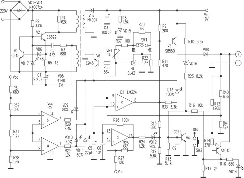 如果是為鎳鎘、鎳氫電池充電,由於這類電池存在一定的記憶效應,需不定時對其進行放電。SW1是鎳鎘、鎳氫、鋰離子電池充電轉換開關。SW1與精密基準電源SL431為運放LM324 ⑨提供兩個不同的精密基準源,由SW1切換。在給鎳鎘、鎳氫電池充電時,LM324 ⑨腳的基準電壓約0.09V(空載);在給鋰離子電池充電時,LM324 ⑨腳的基準電壓約為0.08V(空載),這種設計是由這兩種類型電池特有的化學特性決定的。按下SW2,V5基極瞬間得一低電平而導通,可充電池上的殘餘電壓通過V5的e c極在R17上放電,同時放電指示燈VD14點亮。在按下SW2後會隨即釋放,這時可充電池上的殘餘電壓通過R16、R13分壓,C9濾波後為V4的基極提供一個高電平,V4導通,這相當於短接SW2。隨著放電時間的延長,可充電池上的殘餘電壓也越來越低,當V4基極上的電壓不能維持其繼續導通時,V4截止,放電終止,充電器隨即轉入充電狀態。