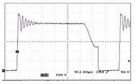 相(xiang)對(dui)於(yu)一(yi)般(ban)的(de)反(fan)激(ji)式(shi)變(bian)換(huan)器(qi),準(zhun)諧(xie)振(zhen)隻(zhi)在(zai)原(yuan)來(lai)電(dian)路(lu)基(ji)礎(chu)上(shang)加(jia)了(le)一(yi)個(ge)無(wu)源(yuan)器(qi)件(jian)電(dian)容(rong)器(qi),不(bu)會(hui)在(zai)電(dian)路(lu)中(zhong)產(chan)生(sheng)多(duo)餘(yu)的(de)電(dian)磁(ci)噪(zao)聲(sheng)。通(tong)過(guo)改(gai)變(bian)控(kong)製(zhi)方(fang)式(shi),利(li)用(yong)變(bian)壓(ya)器(qi)初(chu)級(ji)電(dian)感(gan)與(yu)電(dian)容(rong)器(qi)之(zhi)間(jian)發(fa)生(sheng)諧(xie)振(zhen),在(zai)開(kai)關(guan)管(guan)電(dian)壓(ya)波(bo)形(xing)出(chu)現(xian)波(bo)穀(gu)處(chu)開(kai)通(tong);關斷時利用電容器進行緩衝,可以大大降低開關管上的關斷電壓尖峰和開通電流尖峰,從而降低電磁幹擾。利用安森美的NCP1207製作的準諧振反激式開關電源,其開關管上的電壓波形如圖6所示: