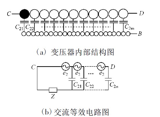 在變壓器內部再增設次級屏蔽繞組如圖12所示,並將E 點與A 點相連,將F 點與C 點相連,此時,一次側屏蔽繞組與次級屏蔽繞組的感應電動勢和寄生電容分布情況是基本一致的,近似有: