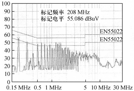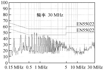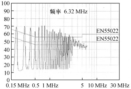 根據圖3 所示的結構。繞製變壓器,並在交流整流濾波後增設13 mH 差模濾波電感和6. 8差模濾波電容,對開關電源進行傳導EMI 測試,結果如圖6 所示。由圖6 可見,傳導EMI 非常嚴重,不能通過電磁幹擾測試。在交流整流前增設35 mH 共模濾波電感,傳導EMI 測試結果如圖7 所示,產品即可通過測試。比較測試結果可得出:在圖3 所示的電路中,主要是由於大量共模傳導EMI,才使電源不能通過電磁幹擾測試。