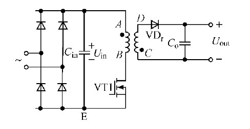 以反激式變換器為例,其主電路如圖1 所(suo)示(shi)。開(kai)關(guan)管(guan)開(kai)通(tong)後(hou),變(bian)壓(ya)器(qi)一(yi)次(ci)側(ce)電(dian)流(liu)逐(zhu)漸(jian)增(zeng)加(jia),磁(ci)芯(xin)儲(chu)能(neng)也(ye)隨(sui)之(zhi)增(zeng)加(jia)。當(dang)開(kai)關(guan)管(guan)關(guan)斷(duan)後(hou),二(er)次(ci)側(ce)整(zheng)流(liu)二(er)極(ji)管(guan)導(dao)通(tong),變(bian)壓(ya)器(qi)儲(chu)能(neng)被(bei)耦(ou)合(he)到(dao)二(er)次(ci)側(ce),給(gei)負(fu)載(zai)供(gong)電(dian)。