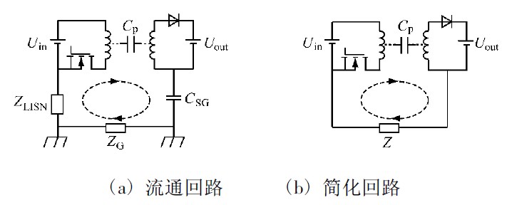 具ju體ti到dao變bian壓ya器qi中zhong,一yi次ci繞rao組zu與yu二er次ci繞rao組zu之zhi間jian的de電dian位wei差cha也ye會hui產chan生sheng高gao頻pin變bian化hua,通tong過guo寄ji生sheng電dian容rong的de耦ou合he,從cong而er產chan生sheng了le在zai一yi次ci側ce與yu二er次ci側ce之zhi間jian流liu動dong的de共gong模mo傳chuan導daoEMI 電流。交流等效回路及簡化等效回路如圖4所示。圖4 中:ZLISN為線性阻抗穩定網絡的等效阻抗;CP為變壓器一次繞組與二次繞組間的寄生電容;ZG為大地不同點間的等效阻抗;CSG為輸出回路與地間的等效電容;Z 為變壓器以外回路的等效阻抗。