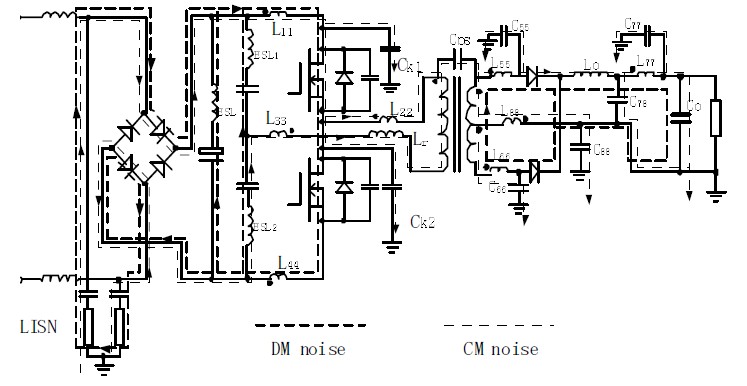 開關電源中由於高頻變壓器原副邊繞組之間存在的耦合電容CW、功率管與散熱器之間存在的雜散電容CK、功率管自身的寄生參數以及印製導線之間由於相互耦合而形成的互感、自感、互容、自容、阻抗等寄生參數而構成共模噪聲和差模噪聲通路,從而形成共模和差模傳導幹擾。在對功率開關器件、變壓器以及印製導線的電阻、電感、電容的寄生參數模型進行分析的基礎上,可獲得變換器的噪聲電流路徑模型。