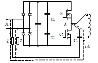 在PWM變換器工作時,伴隨著開關器件的工作,也相應產生了共模噪聲。如圖1 所示,對於半橋變換器,開關管Q1 的漏級電壓始終為U1,源級電位隨開關狀態的改變而在0 和U1/2 之間變化;Q2 的源極電位始終為0,漏極電位在0 和U1/2zhijianbianhua。weishikaiguanguanhesanreqinengbaochilianghaojiechu,wangwangzaikaiguanguandibuyusanreqizhijianjiashangjueyuandianpianhuozhemoshangdaorexingnenglianghaodejueyuanguijiao。zheshideA 點對地之間相當於存在一個並聯耦合電容CK。當開關管Q1、Q2 的狀態發生改變,使A 點電位發生變化時,就會在CK 上產生噪聲電流Ick,如圖2 所示。該電流由散熱器到達機殼,而機殼也即大地與主電源線存在耦合阻抗,形成圖2中虛線所示的共模噪聲通路。於是,共模噪聲電流在地與主電源線的耦合阻抗Z 上產生壓降,形成共模噪聲。