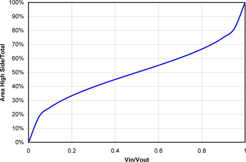 通過圖1,我們知道 50% 轉換比率時出現最佳傳導損耗極值。但是,在其他轉換比率條件下,可以將損耗降至這一水平以下。附錄 1 給出了進行這種優化的數學計算方法,而圖 2 顯示了其計算結果。即使在極低的轉換比率條件下,FET 芯片麵積的很大一部分都應該用於高側 FET。高轉換比率時同樣如此;應該有很大一部分麵積用於低側。這些結果是對這一問題的初步研究,其並未包括如高側和低側FET之間的各種具體電阻值,開關速度的影響,或者對這種芯片麵積進行封裝相關的成本和電阻等諸多方麵。但是,它為確定 FET 之間的電阻比提供了一個良好的開端,並且應會在FET選擇方麵實現更好的整體折中。