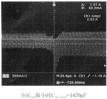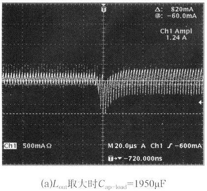 shuchudianyadewendingguochengzhong,yifangmianyoushuchulvbodiangandechunenglaizhububuchong,lingyifangmianyoufankuihuankongzhidianluyuanbiankuaisushuchugengdagonglv。shuchudiangandequzhiyibanyoudianliuwenboxishuλ和電源的空載特性來確定,為了避免容性跳變輸出電壓過大的下衝,使控製電路達到極限,電感的取值要大於λ的理論值計算所得數值,但同時也要考慮輸出失載時的電壓上衝幅度,所以輸出電感也不能太大,大的電感一般不易製作、成本較高,所以電感的實際取值可以用實驗的方法得到。圖4給出了輸出電感Lout不同取值時,容性負載突變時輸出電感電流的跳變波形和最大的容性負載能力。