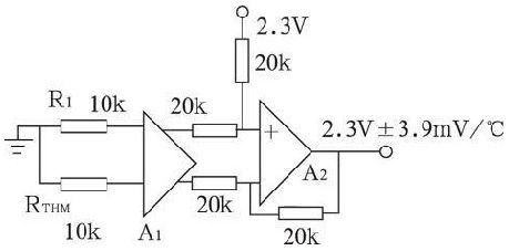 UC3909 內部集成了具有鉛酸蓄電池溫度補償功能的電路如圖4 所示, A1 為電流/ 電壓轉換元件, 其輸入端分別接10 kΩ 普通電阻及10 k Ω 熱敏電阻。A2 與外接四個20 kΩ 電阻組成差動運算放大電路。RT HM 一般貼附在鉛酸蓄電池的表麵殼體用於檢測其溫度, 當鉛酸蓄電池內部溫度變化時, 通過熱敏電阻RTHM 的反饋使U C3909 的基準電壓2. 3 V 也隨溫度按- 3. 9 mV/℃ 的溫度係數變化。從而確保鉛酸蓄電池在浮充狀態下準確工作於安全的浮充電壓, 保護了鉛酸蓄電池。