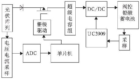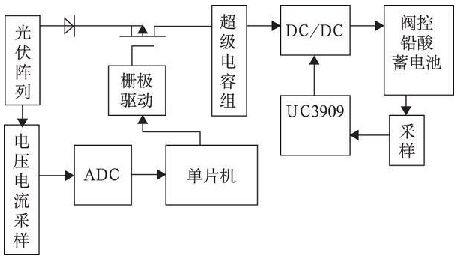 圖2 所示為基於U C3909 太陽能蓄電池充電器電路框圖, 光伏陣列經過電壓電流采樣再經模數轉換將數字信號反饋至單片機, 單片機根據光伏陣列的工作狀況輸出PWM 信號去驅動PMOS 管, 實現對光伏陣列的最大功率跟蹤。超級電容器組、DC/ DC 變換器、UC3909 用來實現對閥控鉛酸蓄電池的四階段充電控製, 並利用超級電容的特性優化充放電過程。本文側重對超級電容器組、U C3909 及DC/ DC 變換器等部分實現對閥控鉛酸蓄電池四階段的充電分析及設計。