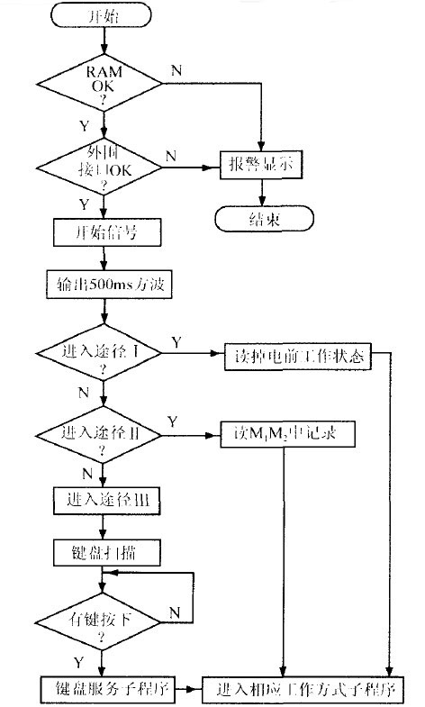 係統進入相應工作方式後,可通過中斷方式接受用戶命令,更換當前工作狀態(中斷程序框圖省略)。圖5示出係統工作流程圖。