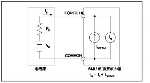 對(dui)於(yu)理(li)想(xiang)的(de)安(an)培(pei)計(ji),當(dang)其(qi)輸(shu)入(ru)端(duan)子(zi)保(bao)持(chi)開(kai)路(lu)時(shi),其(qi)讀(du)數(shu)應(ying)為(wei)零(ling)。然(ran)而(er),現(xian)實(shi)中(zhong)的(de)安(an)培(pei)計(ji)在(zai)輸(shu)入(ru)開(kai)路(lu)時(shi)確(que)實(shi)存(cun)在(zai)小(xiao)電(dian)流(liu)。這(zhe)一(yi)電(dian)流(liu)被(bei)稱(cheng)為(wei)輸(shu)入(ru)偏(pian)移(yi)電(dian)流(liu),是(shi)由(you)於(yu)有(you)源(yuan)器(qi)件(jian)的(de)偏(pian)置(zhi)電(dian)流(liu)以(yi)及(ji)流(liu)過(guo)儀(yi)器(qi)中(zhong)絕(jue)緣(yuan)體(ti)的(de)漏(lou)泄(xie)電(dian)流(liu)產(chan)生(sheng)的(de)。SMU內產生的偏移電流已包括在吉時利4200-SCS型的技術指標中。如圖1所示,輸入偏移電流增加至被測電流,所以儀表測量的是兩個電流之和。