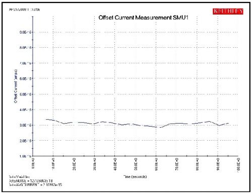 測量每個帶有4200-PA前置放大器的4200-SMU的偏移時,Force HI和Sense HI端子上除金屬帽外不連接任何東西。這些三銷金屬帽已包含在係統中。在進行所有測量之前,SMU應該在帶有連接至前置放大器的Force HI和Sense HI端子的金屬帽的條件下,預熱至少1個小時。如果係統安裝有7.1版或更高版本的KTEI,可采用以下目錄中名稱為“LowCurrent”的項目測量偏移電流:C:\S4200\kiuser\Projects\LowCurrent打開該項目,選擇SMU1offset ITM。點擊圖表標簽,並運行測試。結果應類似於圖2所示的圖形。可能需要利用自動縮放(Auto Scale)功能適當縮放曲線。在圖形上右擊,即可找到自動縮放功能。4200-PA前置放大器連接至SMU時,偏移電流應該在fA級。電流偏移可為正或負。根據公布的4200-SCS型的安培計技術指標驗證這些結果。