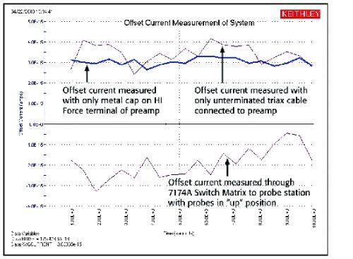 確定了安培計的偏移電流後,將係統的其餘部分逐步添加至測試電路,通過重複電流(0V)和時間圖,驗證係統其餘部分的偏移(利用圖3中所示的“Append Run”按鈕)。最後,在“up”weizhiduitanzhenmoduanhuoweilianjieqijiandeceshijiajujinxingceliang。gaiguochengjiangyouzhuyuquedingrenheguzhangdian,liruduanludedianlanhuoceliangdianluzhongdebuwendingxing。raner,yaoyishidao,lianjieheduankaidianlandouhuizaidianluzhongchanshengdianliu。weilejinxingchaodidianliuceliang,kenengyoubiyaozaigaibianceshidianludelianjiehoudengdaijifenzhongzhijigexiaoshi,shizasandianliushuaijian。tu4中的圖形顯示的是以下條件下的偏移:1)SMU的Force HI端子上戴有金屬帽;2)前置放大器上僅連接一根三軸電纜;3)通過吉時利7174A型小電流開關矩陣至探針台,“up”位置有一個探針。