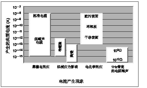 確定了電流偏移、漏流及所有不穩定性後,采取措施減小測量誤差將有助於提高測量準確度。這些誤差源包括建立時間不足、靜電幹擾、漏泄電流、摩擦效應、壓電效應、汙染、濕度、接地環路,以及源阻抗。圖5中彙總了本節討論的部分電流的幅值。