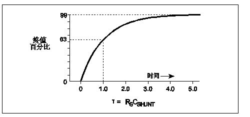因此,讀數穩定至最終值的1%所需的建立時間為τ的5倍,也就是50秒。圖7所示為RC電路的階躍電壓指數響應。經過一個時間常數(τ = RC)後,電壓上升至最終值的63%。