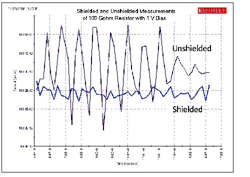 為了減小靜電場影響,被測電路可被密封在一個靜電屏內。圖8所示為非屏蔽和屏蔽測量一個100GΩ電阻之間的巨大差異。非屏蔽測量比屏蔽測量時的噪聲要大得多。