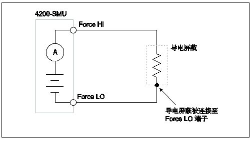 · 屏蔽DUT,並將屏蔽層在電氣上連接至測試電路公共端——4200-SCS的Force LO端子。