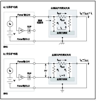 在圖11b中,金屬安裝板被連接至SMU的保護端子。隔離絕緣體頂部和底部的電壓接近相同電勢(0V壓降),所以在隔離絕緣體中就不會有漏流影響測量準確度。由於金屬安裝板將處於保護電勢,所以為安全起見,金屬屏蔽必須連接至地。