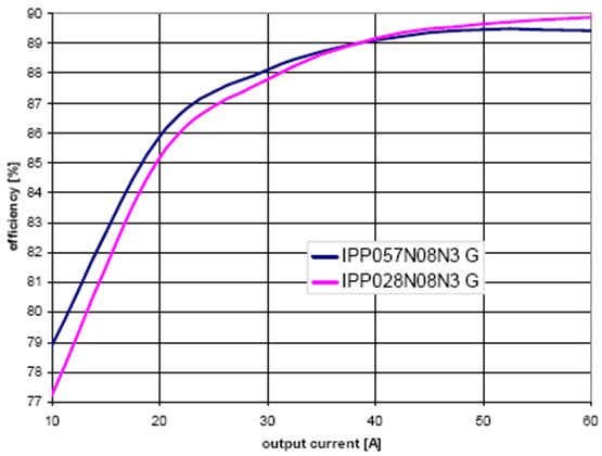 圖8表明了在實際應用中,不同MOSFET RDS(on) 值範圍的影響。圖中所示為在服務器電源中分別測得的IPP028N08N3 G和IPP057N08N3 G的值。