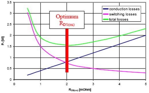當RDS(on)在1毫歐姆至3毫歐姆範圍內時,總功耗始終大致相同。但是,在1毫歐姆以下,RDS(on)僅下降0.5毫歐姆,便會令總功耗提高一倍,從而嚴重降低電源轉換器的效率。