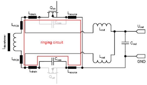 並且,環路的寄生電阻會抑製振蕩(Coss = MOSFET的輸出電容, Lstray = Lsource + Ldrain + LPCB + Ltransformer)。僅當二次側的環路電感限製了電流換向時,此處討論的波形形狀才有效。這就意味著,限製di/dt的不是一次側MOSFET的開啟速度,而是電源的二次側的雜散電感。