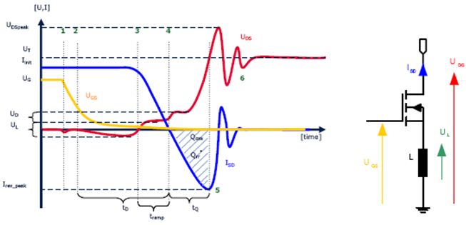 分析首先從開關的導通狀態開始:此時,柵極電壓很高,漏源電壓幾乎為零,電流從源極流向漏極。在點1時,柵極被關斷。在UDS波形中,這表現為柵極電容CG放電產生的負電壓驟降很小。此放電會在MOSFET的源極連接處產生具有大的電流變化(di/dt)的電流峰值。在感應作用下,源極的這種電感會引起UDS波形發生壓降。