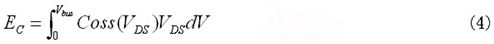 如果依據漏源電壓變化的輸出電容值可得,則輸出電容儲能可用公式(4)求(qiu)出(chu)。雖(sui)然(ran)電(dian)容(rong)曲(qu)線(xian)顯(xian)示(shi)在(zai)數(shu)據(ju)表(biao)中(zhong),但(dan)要(yao)想(xiang)從(cong)圖(tu)表(biao)中(zhong)精(jing)確(que)讀(du)出(chu)電(dian)容(rong)值(zhi)並(bing)不(bu)容(rong)易(yi)。因(yin)此(ci),依(yi)據(ju)漏(lou)源(yuan)電(dian)壓(ya)變(bian)化(hua)的(de)輸(shu)出(chu)電(dian)容(rong)儲(chu)能(neng)將(jiang)由(you)最(zui)新(xin)功(gong)率(lv)MOSFET數據表中的圖表給出。通過圖3顯示的曲線,使用公式(5)可以得到期望的直流總線電壓下的等效輸出電容。