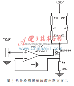 如果隻是單純地將IRF640放在電橋的上方,而不加線性光耦HCNR201。如圖4所示,當場效應管IRF640截止,則M、N上的共模電壓為零,這樣雖然可以避免圖3方案的問題,但是當橋流較大時(200 mA,橋電阻為100Ω),則場效應管IRF640的柵極電壓達到20多伏,超過了AD8661的電源電壓範圍(±18 V)。因此圖3、圖4方案都不可行。