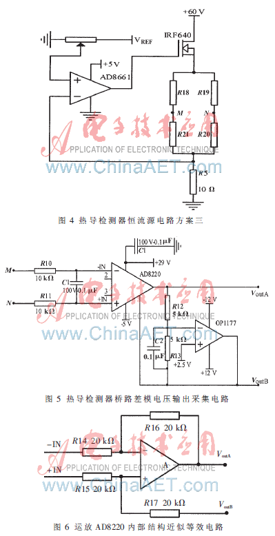 本文對三套恒流源進行分析、比較、實驗,表明方案一的基線噪聲、溫度漂移小,優於現有色譜儀熱導檢測器的指標,而且電橋檢測電路承受的共模電壓小,有利於保護檢測電路。