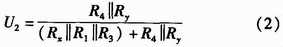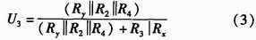 如圖2所示,U+和U-為被測線路的母線供電電壓,正常工作時兩母線間的電壓差Ux+y為440 V,且隨蓄電池內阻變化。Rx,Ry分別為被測線路的正母線絕緣電阻和負母線絕緣電阻。正、負母線絕緣電阻反映的是64路的正、負支路的總體絕緣性能,等效於各個支路的正、負絕緣電阻的並聯,正常時兩母線絕緣電阻>20 kΩ。Ux和Uy為正負母線對地電壓,大小隨正負母線的絕緣電阻變化,但兩母線電壓差恒定為Ux+y。為了檢測正負母線電壓Ux,Uy,Rx,Ry,係統采用了“平衡-不平衡檢測法”檢測母線電壓和母線絕緣電阻。計算公式如式(1)所示。