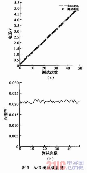 為了達到好的測試效果,A/D采集必須達到一定的測試精度,圖5是A/D采集的實測數據和測試誤差分析曲線,從圖中可以看出,A/D采集的誤差約20 mV,屬於正常範圍,因為係統采用8位A/D,5 V基準電壓。這個采樣精度滿足整體的設計要求。