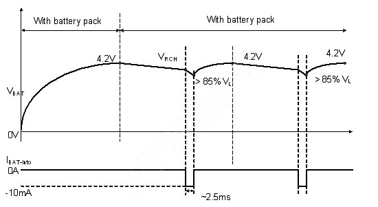 使用者亦有可能在充電或式充電完畢後,在未將電源移除的情況下,即抽離電池的情況。為避免造成危險,IC內部應具有如圖7, 8的電池存在偵測機製。充電IC會以短時間脈衝(每370ms產生2ms的脈衝)方式抽取電池電流,此時若電池存在,則偵測到的電池電壓應大於一預設閥值;若電池已切離,則充電IC偵測到一低電壓,即可判定為電池斷開狀態,並將電池端電壓切斷,保護使用者安全。