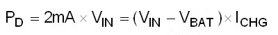 假設使用5.5V電源供應器對單顆1200mAh鋰離子電池進行充電,在0.7°C快速充電電流時,且電池電壓為3V的條件下,可以預估IC運作的最大耗電量為,1.762W的耗電最大值,此一功耗會使得熱阻抗60°C /W的3×3毫米QFN封裝溫度溫升127°C,即便環境溫度0°C時,也已經超過所允許的125°C矽晶片操作溫度最大值。若設定充電電流為0.6A(0.5C),則可降低IC溫升為90度,可以操作於35度的環境溫度中,因此是較佳的設定電流。