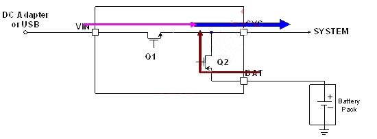 LD6275具有適應性電源路徑管理(Adaptable Power Path Management, APPM)功能,其為以供給係統端用電為主,對電池充電為輔,如圖3所示;當係統用電超過輸入電源的供給限製時,其電池亦能主動開啟放電功能同時對係統端供給其所需之電能需求,如圖4所示。
