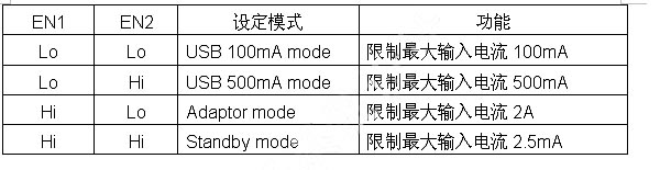 LD6275將電源適配器/USB埠的5V直流電源進行降壓穩流,對鋰離子電池進行充電,為防止電源適配器的過電流超載,可以外部電阻RCISET設定最大充電電流限製。同時支援電腦USB埠充電模式,並依據外部腳位EN1與EN2進行設定,各模式請見表1.透過為USB 500mA與USB 100mA操作模式設定,可以保護PC端USB埠避免過載。