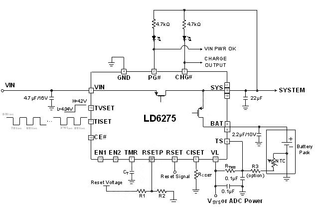 為滿足低耗電可攜式產品對於更精確、更安全的充電器應用需求,許多IC製造商發展出低成本線性充電器。圖2是以通嘉科技的LD6275充電IC為設計範例,構成僅需少數外部零件的獨立式線性充電器電路,其具備1.5A的最大充電電流。